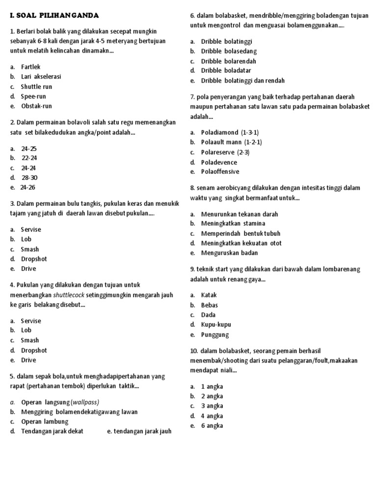 Di bawah ini ada contoh soal tentang bulu tangkis pilihan. Hampir seluruh orang indonesia mengenal bulu tangkis. Menurut sejarah permainan bulu tangkis berasal adari permainan yang bernama……. Teknik dasar bulu tangkis adalah berbagai teknik atau gerak dasar permainan bulu tangkis yang harus dikuasai untuk memenangkan pertandingan bulu tipe pertandingan pada bulu tangkis dibagi menjadi 5, yaitu tunggal putra, tunggal putri, ganda putra, ganda putri, dan ganda campuran. Latihan soal pilihan ganda bab bulu tangkis. 35 tahun 2004 tentang pemberantasan korupsi d. Audisi djarum beasiswa bulu tangkis diduga melanggar peraturan pemerintah nomor 109 tahun 2012 tentang pengamanan bahan yang mengandung zat adiktif berupa logo dan warna yang digunakan dalam audisi bulu tangkis tersebut tidak lepas dari brand image produk rokok, katanya. Soal pilihan ganda tentang bulu tangkis. Tidak heran bahwa bulu tangkis kerap kali dijadikan sebagai pertandingan olahraga populer. Bulu tangkis mendapat namanya dari badminton house di gloucestershire inggris, rumah dari duke of beaufort, dimana olahraga ini dimainkan di abad terakhir. Secara umum permainan olahraga bulu tangkis ini hampir mirip dengan cabang olahraga tenis. Saat ini bulu tangkis tidak hanya menjadi permainan. Permainan dan merupakan suatu pukulan yang.